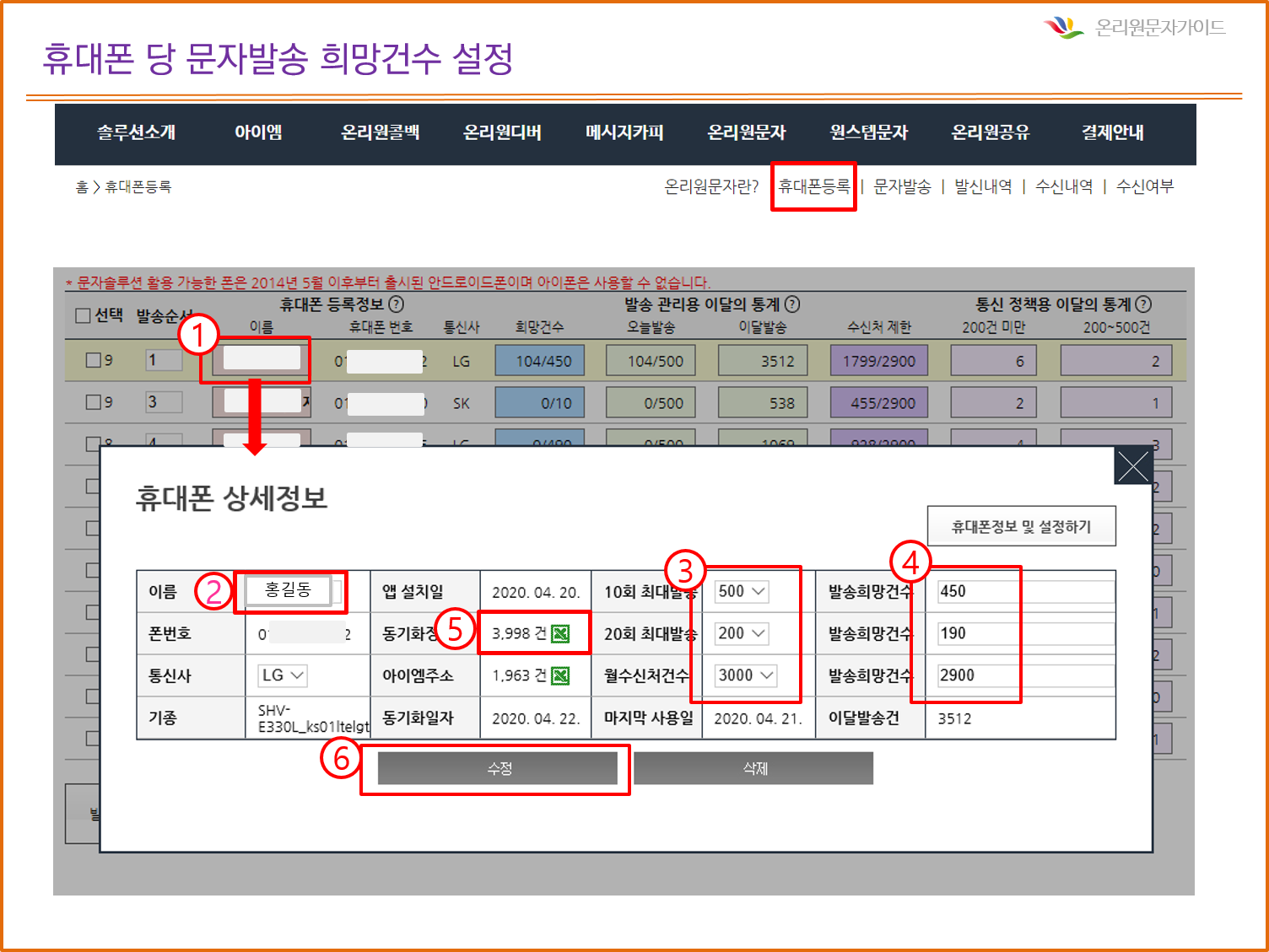 문자 [온리원문자] 발송건수 및 수신처수 직접 설정 2020-04-22 46555